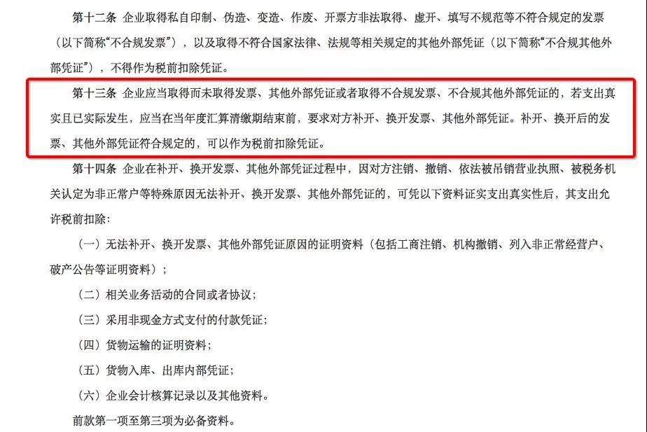 企業(yè)應(yīng)當(dāng)取得而未取得發(fā)票、其他外部憑證或者取得不合規(guī)發(fā)票、不合規(guī)其他外部憑證的,若支出真實(shí)且已實(shí)際發(fā)生,應(yīng)當(dāng)在當(dāng)年度匯算清繳期結(jié)束前,要求對方補(bǔ)開、換開發(fā)票、其他外部憑證。補(bǔ)開、換開后的發(fā)票、其他外部憑證符合規(guī)定的,可以作為稅前扣除憑證。