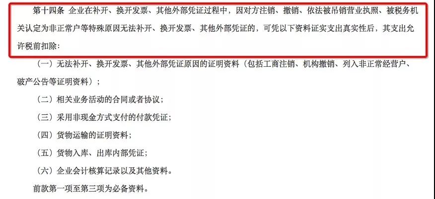 企業(yè)在補(bǔ)開、換開發(fā)票、其他外部憑證過程中,因?qū)Ψ阶N、撤銷、依法被吊銷營業(yè)執(zhí)照、被稅務(wù)機(jī)關(guān)認(rèn)定為非正常戶等特殊原因無法補(bǔ)開、換開發(fā)票、其他外部憑證的可以入賬。