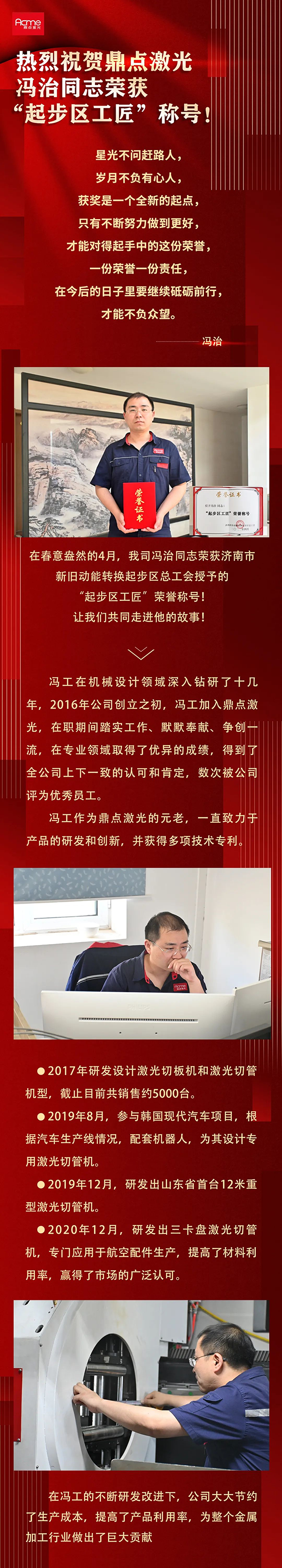 熱烈祝賀鼎點激光馮治同志榮獲“起步區工匠"稱號!