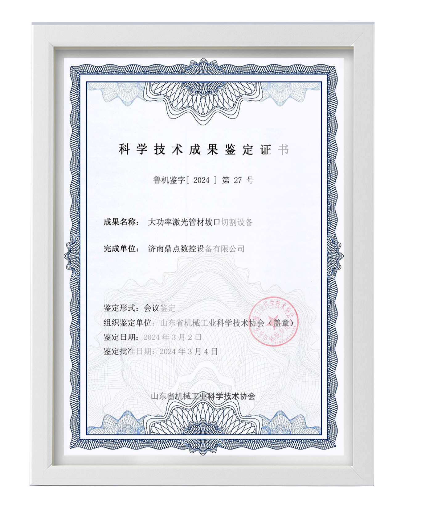 3月2日上午,山東省機械工業科學技術協會在濟南召開了由濟南鼎點數控設備有限公司(以下簡稱“鼎點激光”)“大功率激光管材坡口切割設備”產品成果鑒定會,鑒定委員會認為,該產品主要性能指標達到國際先進水平.