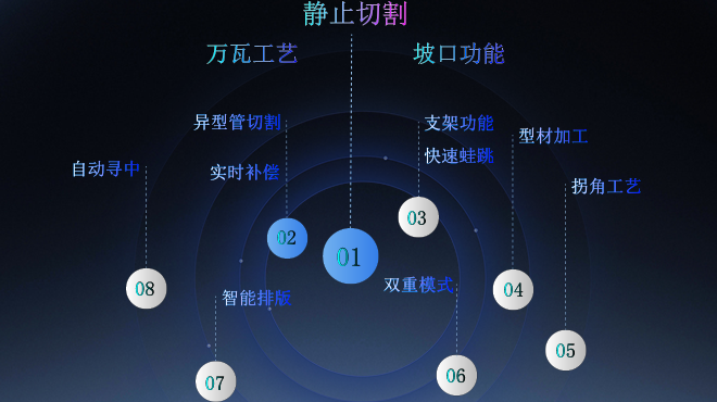 支持飛行切割,蛙跳,引刀線,冷卻點、相貫孔、刀珞排序 自動排樣、焊縫補償、模擬切割、微連,預穿孔,自動調焦 一鍵切斷等多種工藝